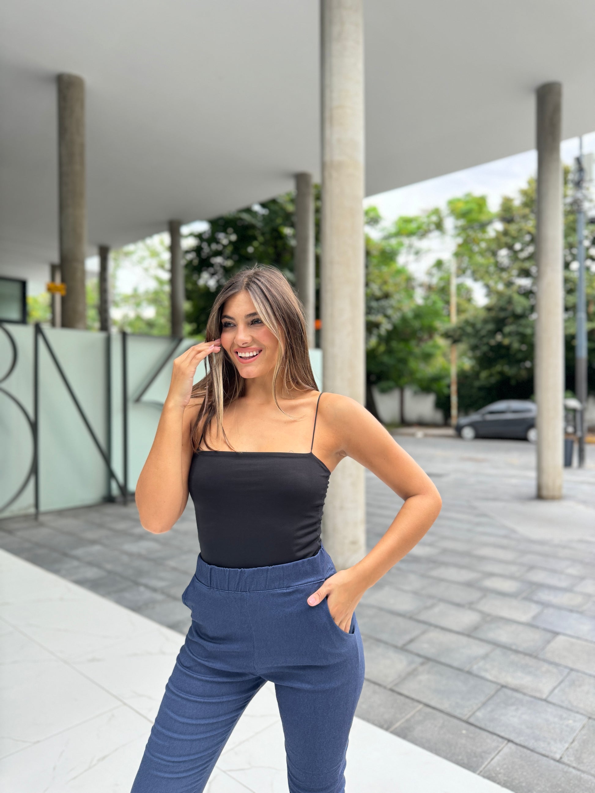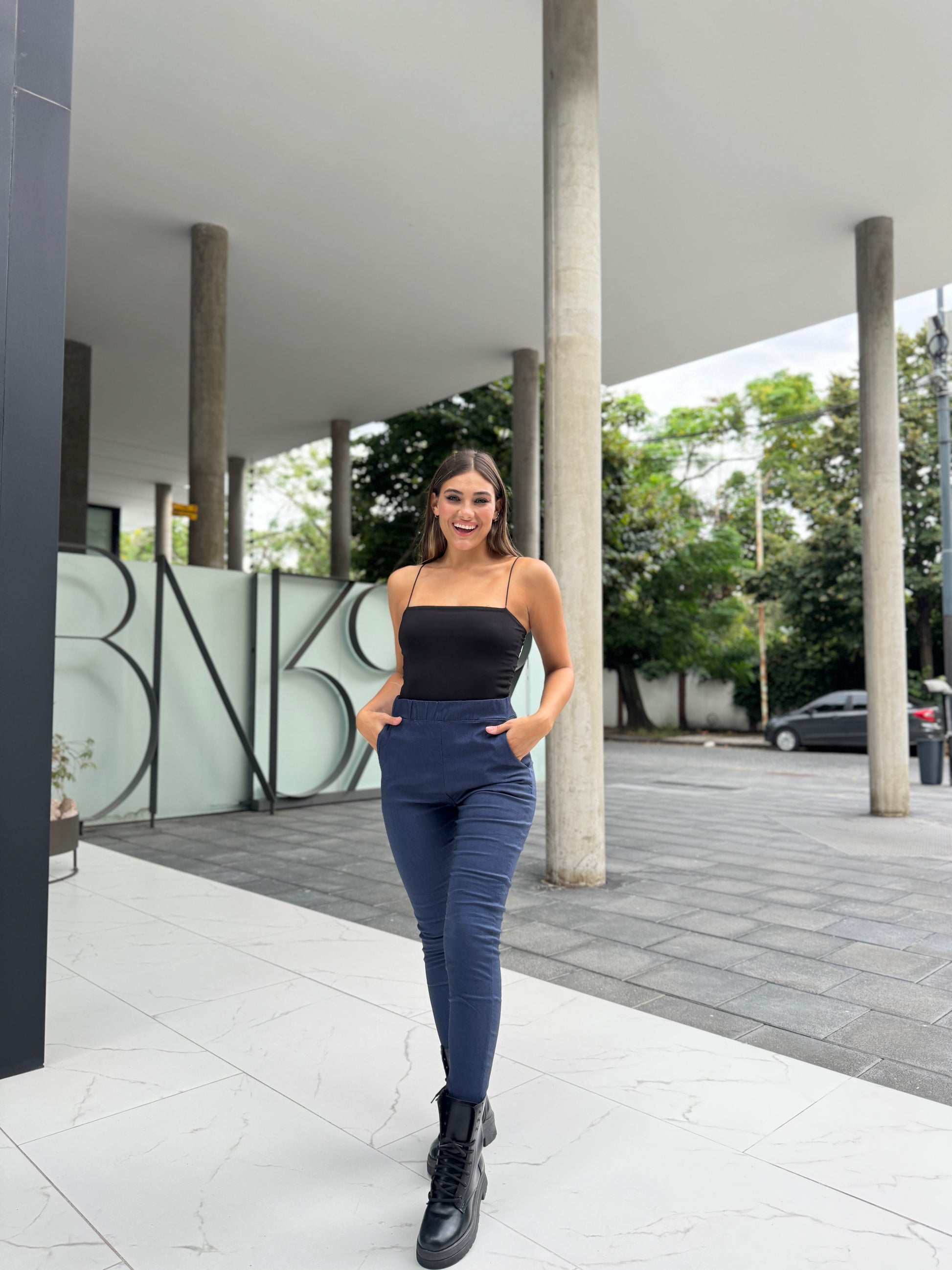 Pantalón de tela bengalina elasticada, tiro alto, cintura elasticada, bolsillos laterales.